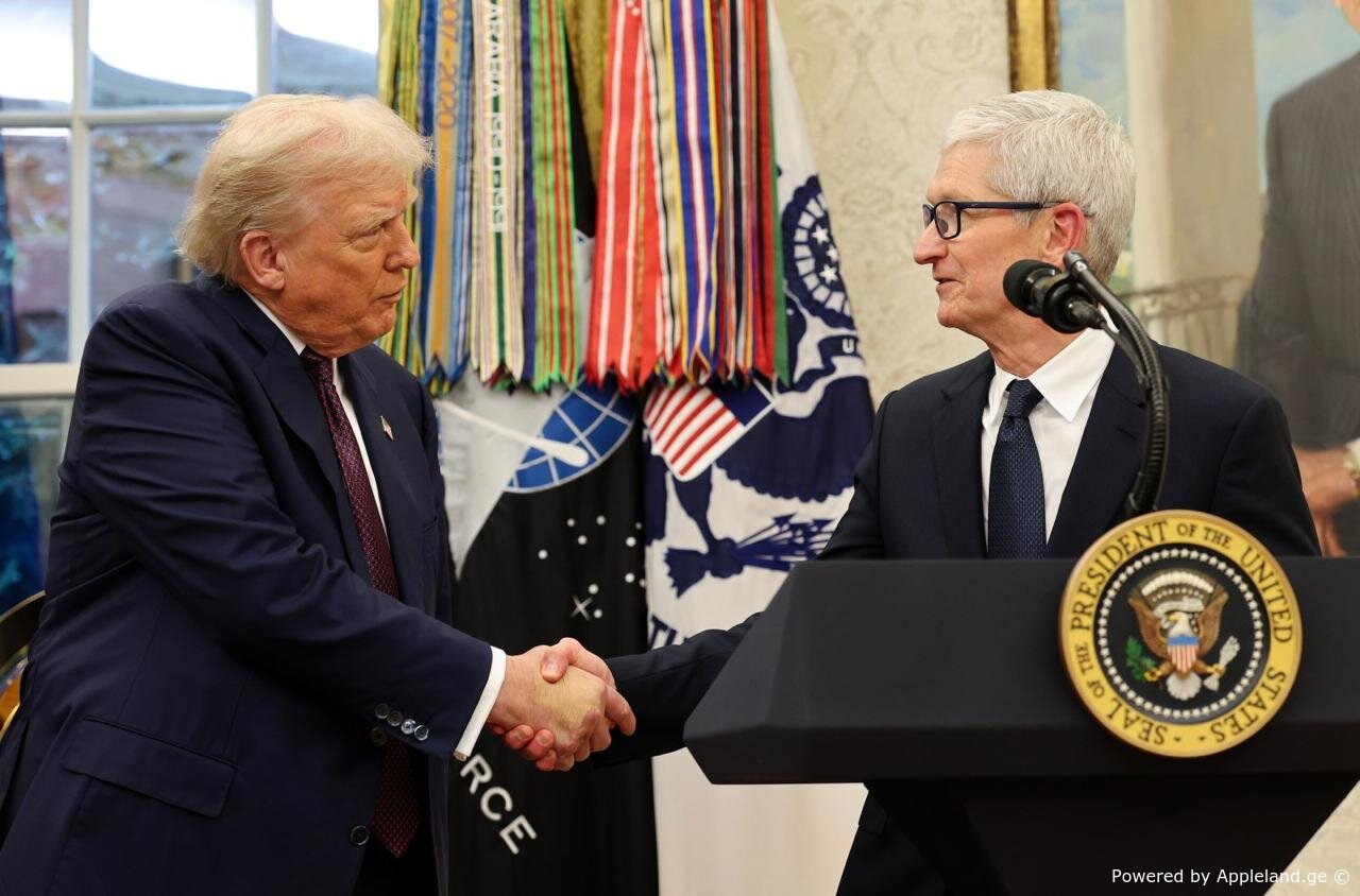 თეთრ სახლში გამართულ პრესკონფერენციაზე, რომელიც Apple-ის აშშ-ში წარმოების ახალ გეგმებს ეხებოდა, აღმასრულებელმა დირექტორმა ტიმ კუკმა პრეზიდენტ დონალდ ტრამპს საჩუქარი გადასცა: iPhone-ის მინის მწარმოებელი Corning-ის „უნიკალური“ მინის ნაჭერი, რომელიც 24 კარატიან ოქროს ბაზაშია მოთავსებული.